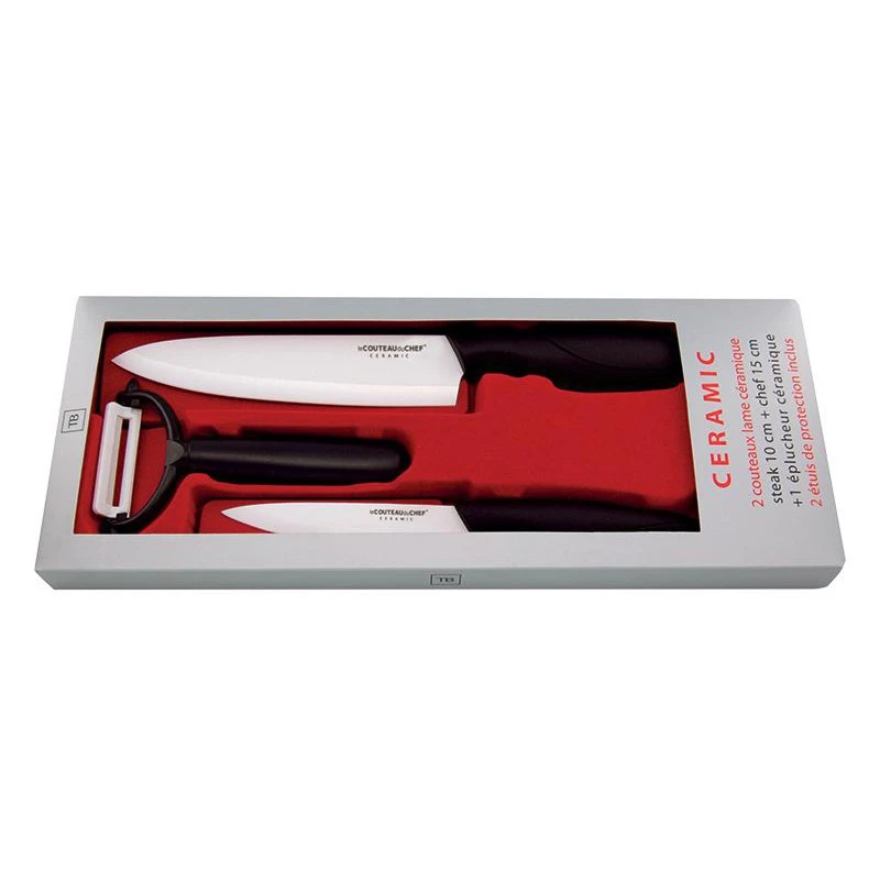 Ce coffret TB se compose de 3 pièces en céramique, délicatement posées sur un tissu de couleur rouge pour la note luxueuse, hyper élégante. Par 3 pièces, il faut entendre couteau d’office, couteau de chef ainsi qu’éplucheur rasoir. Un trio en céramique blanche qui permet de pouvoir éplucher/couper les légumes, mais aussi trancher les viandes et autres aliments grâce au couteau de chef très polyvalent. Les 3 pièces possèdent toutes un manche de couleur noire, en ABS, assurant facilité d’entretien et surtout confort de prise en main en toutes circonstances. Un beau coffret, par TB, qui ne manquera pas de donner envie de cuisiner !