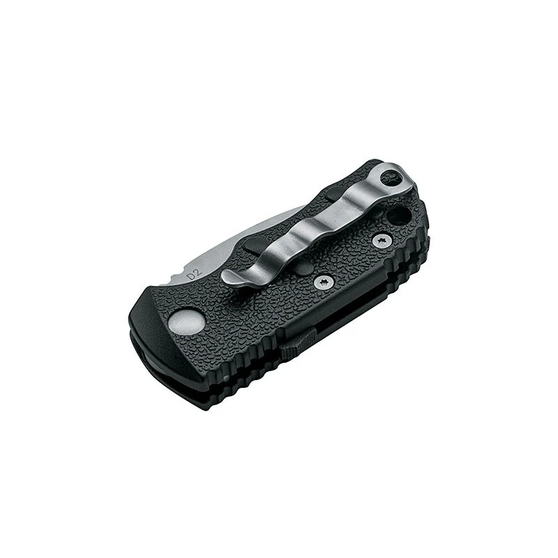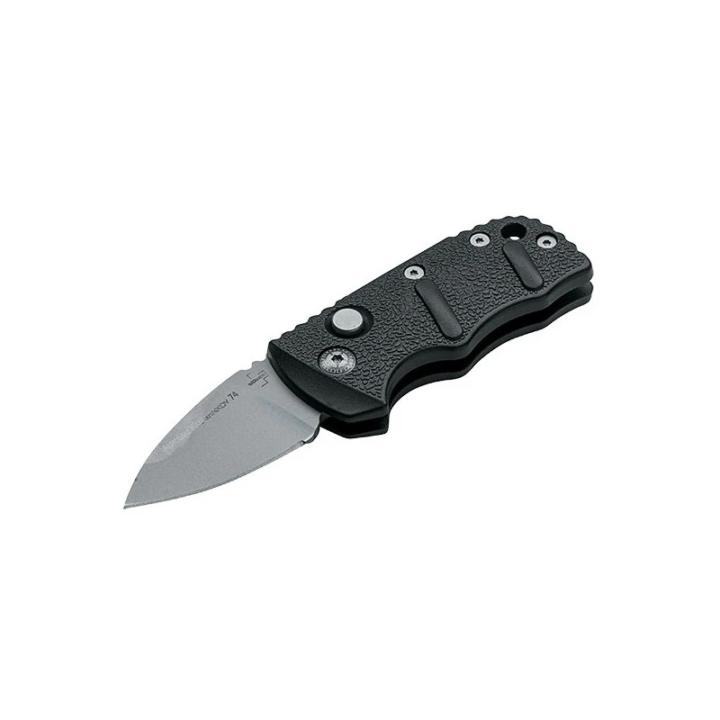 Situé entre le modèle standard et mini, le Böker Plus AKS-74 Kalashnikov Stubby Swiss est un couteau automatique mesurant au total 12cm de longueur. Il va faire le bonheur de celles et ceux qui désirent acquérir un couteau peu encombrant mais puissant. Ce modèle Stuby Swiss 01KALS91 est doté d’une courte lame en D2 de 48mm de long, ce couteau automatique est en conformité avec la législation Suisse. Il possède également un manche noir en aluminium doté d’une forte ergonomie si bien que le contrôle est maximal. Une forme qui n’est d’ailleurs pas sans rappeler celle du célèbre fusil d’assaut Kalashnikov ! Les motifs texturés font en sorte que le confort de prise en main soit exceptionnel en toutes circonstances. Le couteau AKS-74 Kalashnikov Stubby Swiss, par Böker Plus, est simple à transporter grâce à son faible gabarit, mais aussi son clip de poche et son trou pour lanière.