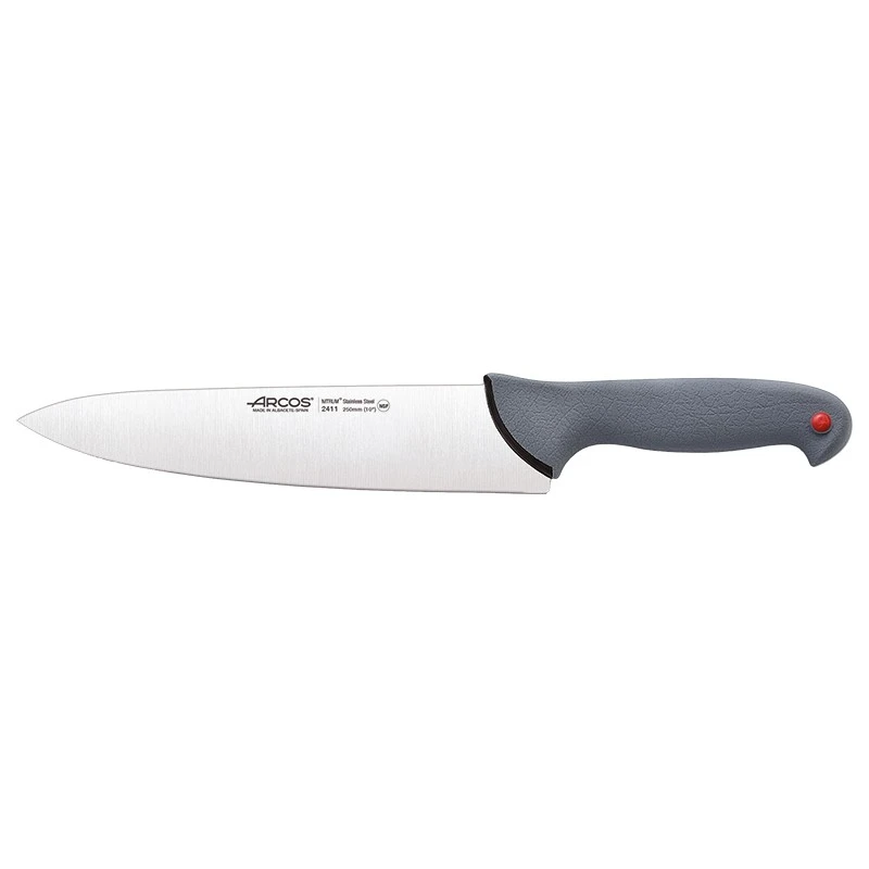 Côté lame, elle est toujours fabriquée en acier inoxydable Nitrum pour des performances de coupe à couper le souffle. Pour les cuisiniers professionnels, la longueur de lame est un critère important : sur ce modèle, elle mesure pas moins de 250mm. Sachez que le site propose également des couteaux de chef Arcos gamme Colour Prof avec des lames plus grandes ou plus petites. Pour optimiser vos découpes, n’oubliez pas nos planches à découper de grande qualité.