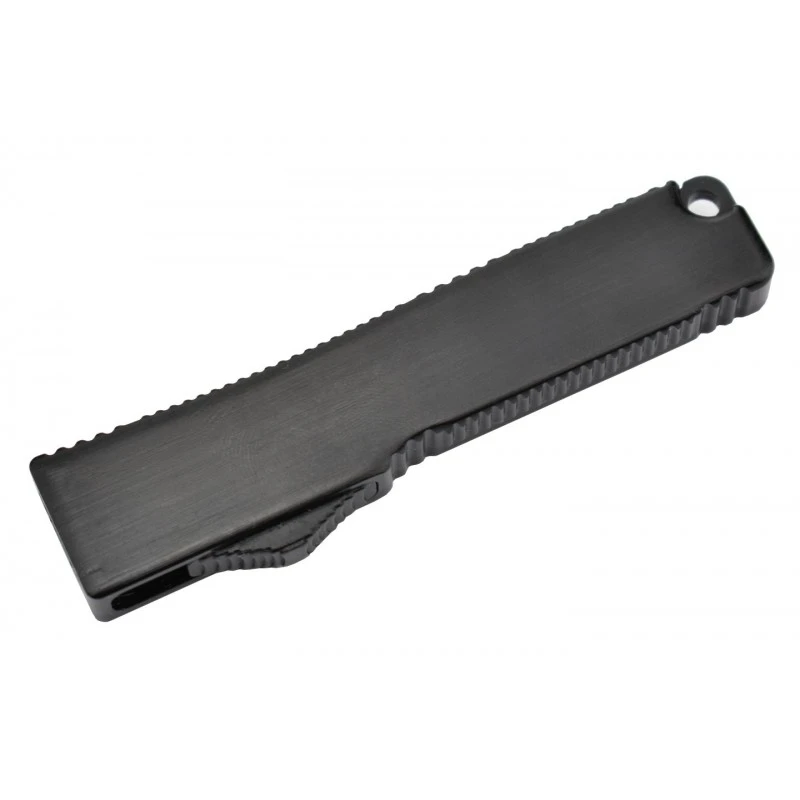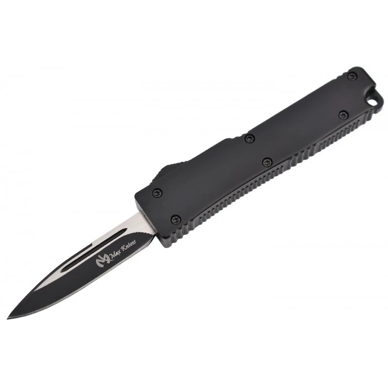 Le Max Knives MKO30 est un couteau qui a tout pour plaire, sans exception. C’est un couteau automatique OTF, à ouverture frontale, et donc par définition très simple d’utilisation, il n’y a qu’à utiliser le bouton ergonomique du manche noir pour actionner la lame. Cette dernière mesure 5cm de long, elle est bicolore ce qui apporte une touche de style, d’élégance, elle est de ce fait en parfaite harmonie avec la poignée noire en aluminium anodisé, gage d’ergonomie et de robustesse. Tranchante, la lame est marquée par le logo Max Knives, et peut être gravée par un texte, une inscription au choix, sur les deux faces. Le manche noir mesure précisément 82mm de long ce qui assure un transport simple et sans encombre quotidiennement, c’est d’autant plus vrai par la présence d’un passe-lacet en bout. Le couteau automatique OTF Max Knives MK030 est ici noir, mais il existe aussi en rouge afin d’apporter une note colorée à vos aventures.