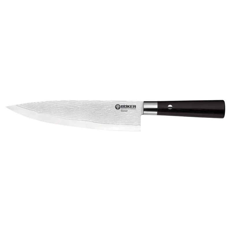 Ce modèle 130421DAM appartient à la collection Damascus Black de la marque Böker. C’est un couteau de chef caractérisé par une lame large, de grande taille, ici 212mm, construite en acier damas 37 couches. Au tranchant rasoir, la lame comprend un noyau dur et résistant aux chocs, elle est également décorée par l’inscription Böker Damast.