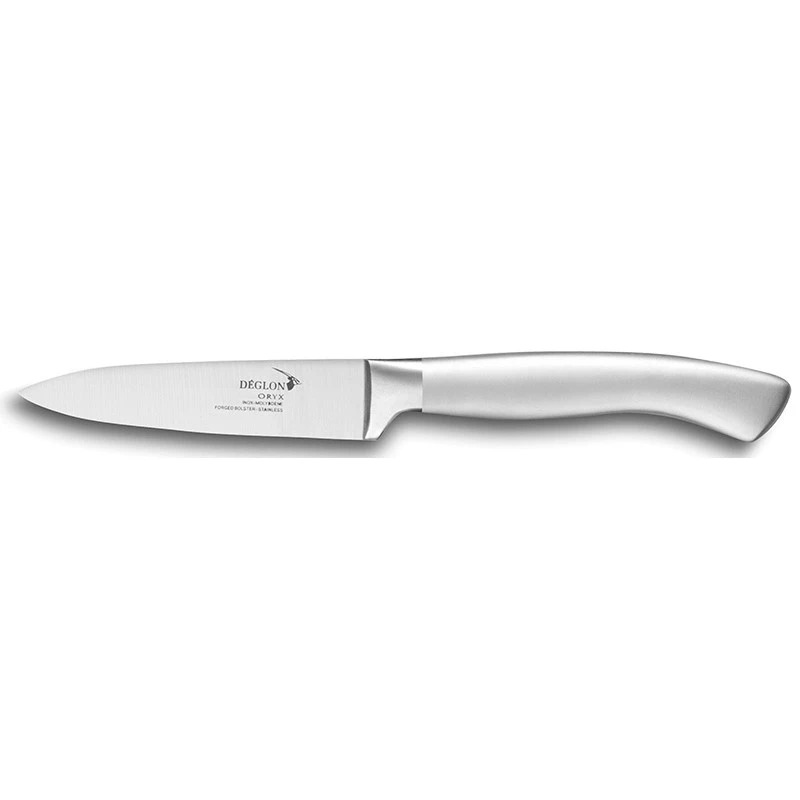 Le couteau d’office Oryx par Déglon dispose aussi d’un manche en acier inoxydable 18/10, bénéficiant d’une belle finition sablée ce qui lui confère un certain charme, tout en le rendant particulièrement agréable au toucher. C’est clairement ce qu’on appelle joindre l’utile à l’agréable ! Le couteau d’office Déglon Oryx a une allure très moderne, contemporaine, il est compatible avec le lave-vaisselle ce qui rend l’entretien aisé quotidiennement. On soulignera également la parfaite étanchéité entre la lame, la mitre et le manche.