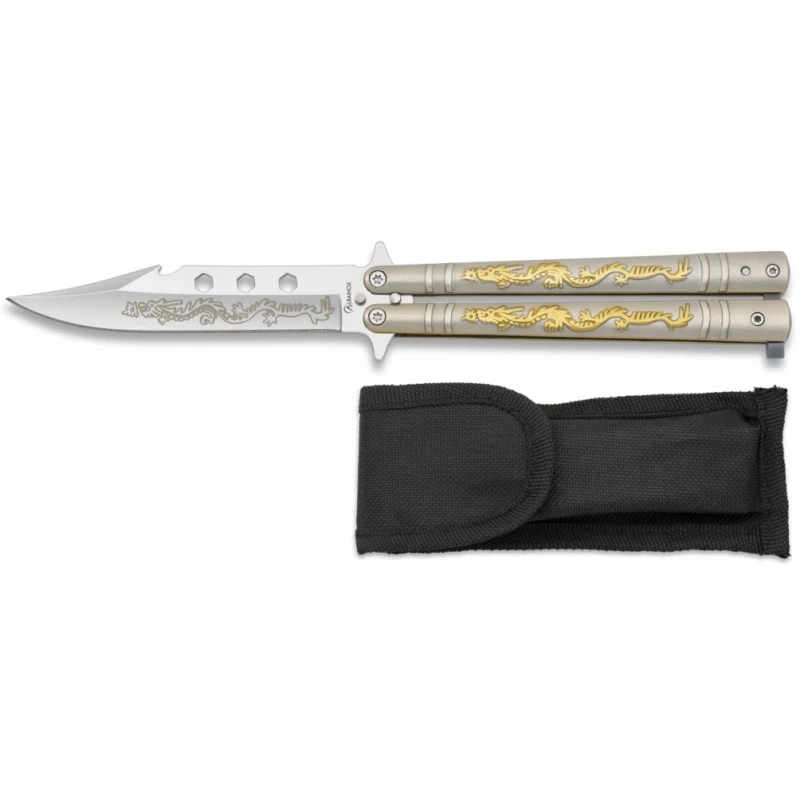 Une fois de plus, c’est le dragon qui est à l’honneur sur ce couteau papillon Albainox muni de la référence 02182. Vous savez, cette créature légendaire, fantastique, très appréciée des enfants, et qui est fortement répandue dans la culture asiatique. Et bien c’est ce même dragon qui vient décorer avec goût ce balisong Albainox fabriqué intégralement en acier, et par conséquent doté d’une résistance optimale face à la corrosion. Le manche est décoré sur chaque partie par un dragon doré en relief, la lame de 105mm elle, est aussi marquée par le même motif dragon, mais juste coloré en gris au niveau du contour. Elle est aussi ajourée par trois formes géométriques positionnées juste au-dessus de ce fameux dragon. Conçu en Espagne, ce couteau papillon Albainox en acier est aussi livré avec son étui en nylon noir comme vous pouvez le voir sur l’image du produit. Il jouera à merveille son rôle de protection/rangement lors des déplacements.