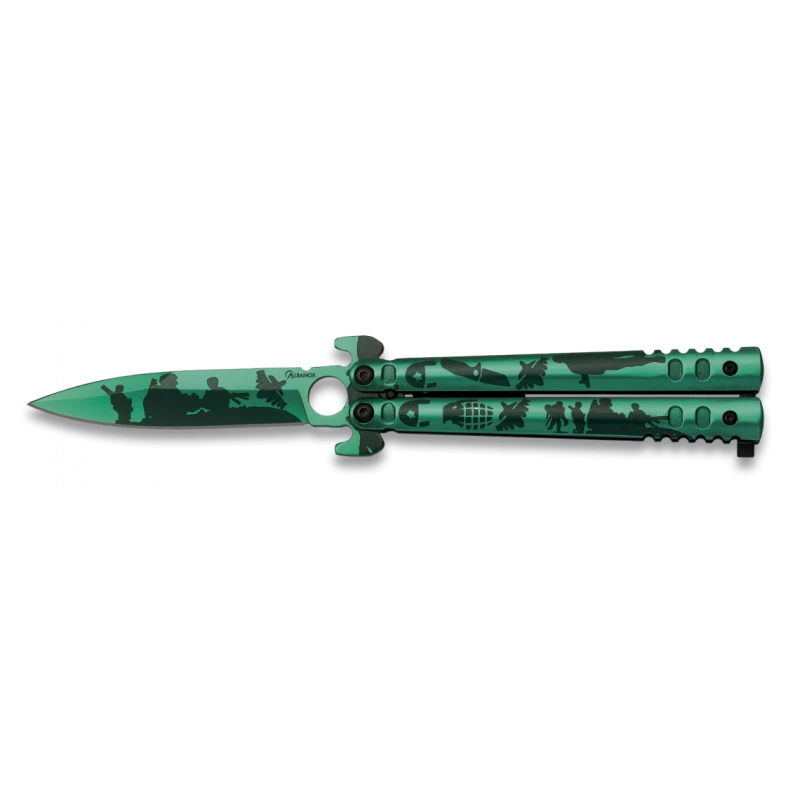 Ce couteau papillon au design original est signé par la marque espagnole Albainox. De couleur vert brillant ce balisong présente sur son ensemble (lame et manche) des silhouettes mates vert foncé de soldats, couteaux, grenades et avions. Le thème est parfaitement illustré, donnant à ce papillon un look militaire.