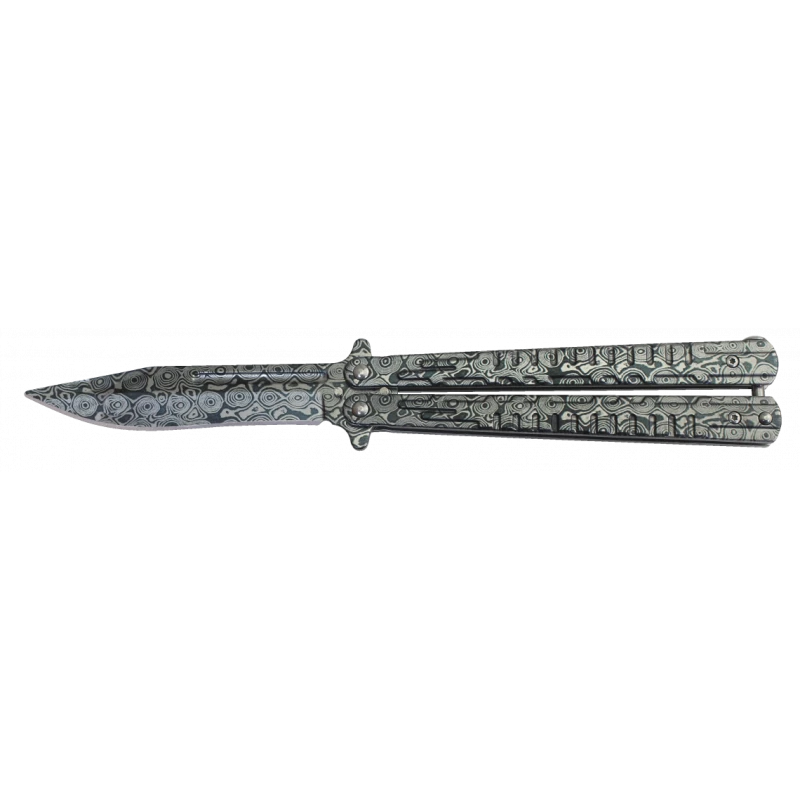 La lame de 10 cm est fabriquée en acier inoxydable de style damas. L’acier damas est réputé pour sa beauté naturelle et ses motifs distinctifs. Chaque lame est unique, avec des motifs ondulés et tourbillonnants qui ajoutent une touche d’élégance à ce couteau papillon.