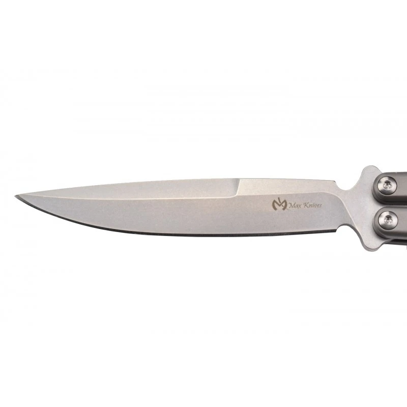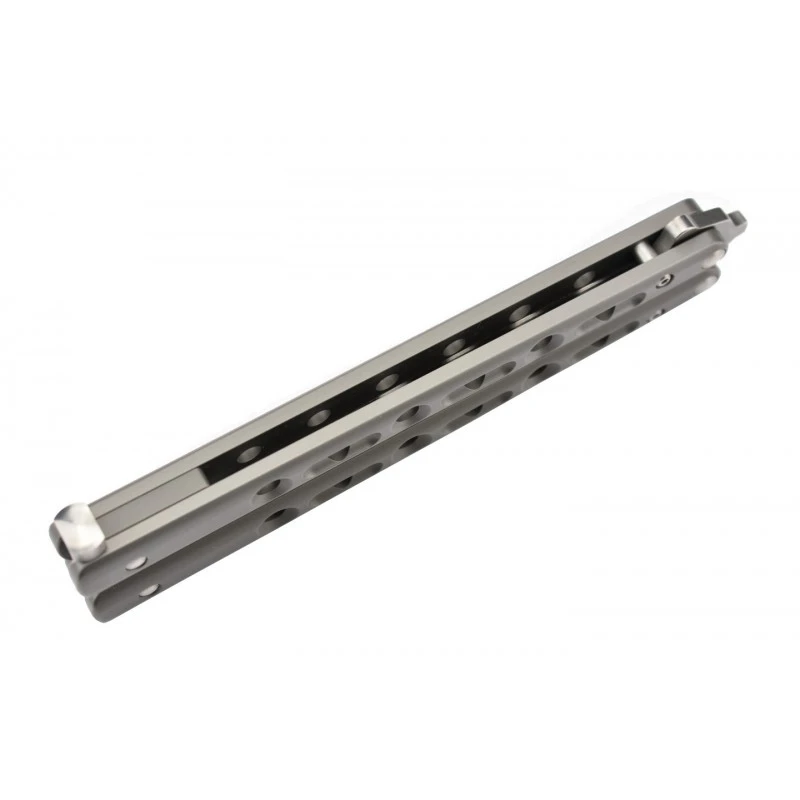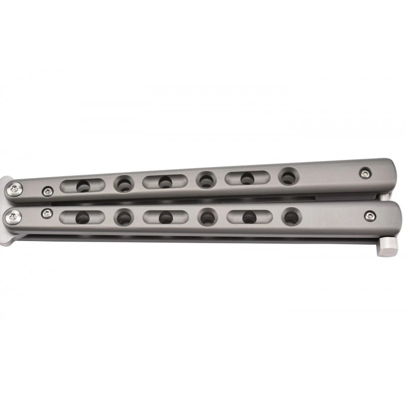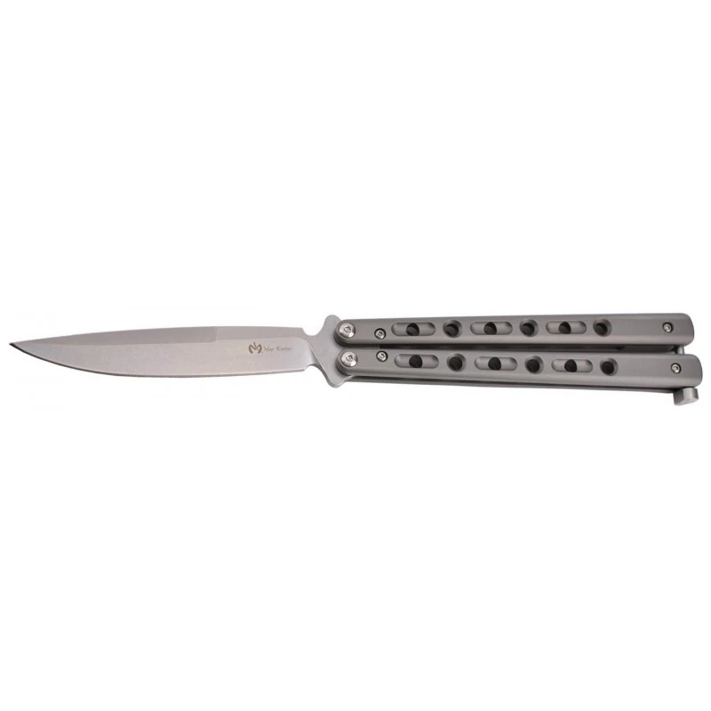 Le Max Knives P40S est un couteau papillon, dit balisong, de très haute qualité. Pour s’en rendre compte, il suffit d’observer son manche en titane gris, qui se sépare en deux parties. Esthétique, il est décoré par de nombreux ajours et confère une prise en main très confortable à l’utilisateur. Pour information, il mesure 138mm de long ce qui ajoute une facilité de transport supplémentaire.