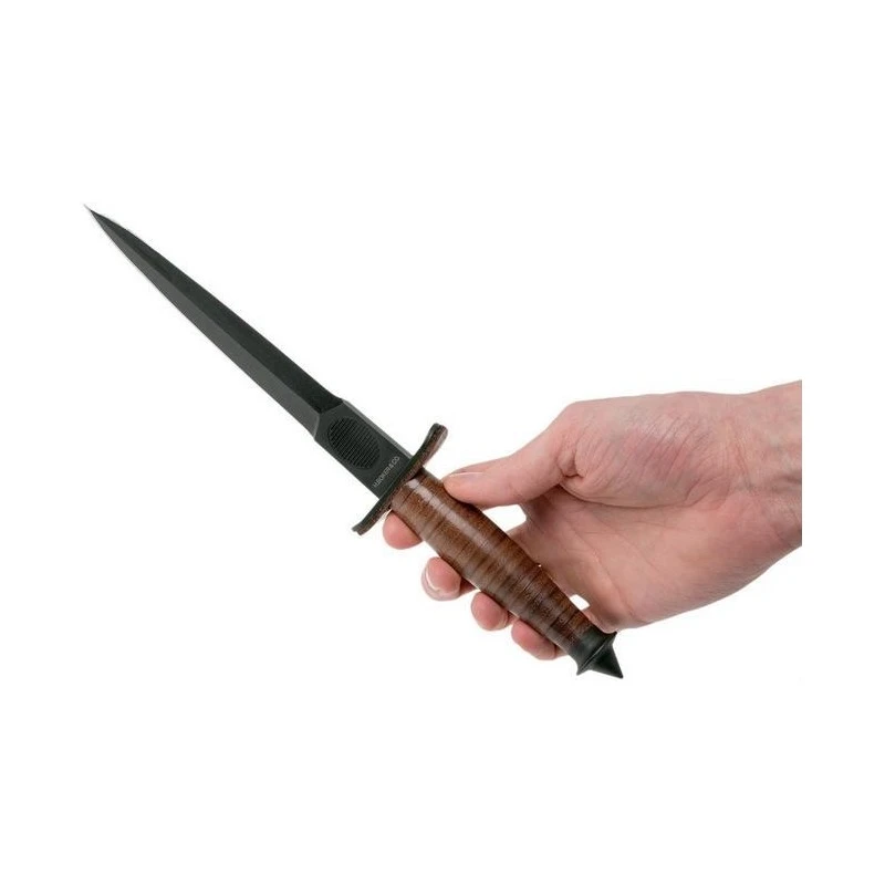 Le couteau de combat V-42 est constitué d’un manche avec des rondelles en cuir naturel empilées les unes après les autres pour une prise en main extraordinaire. Sa lame noire affûtée des deux côtés a la particularité de posséder un espace pour y poser votre pouce. Cette dernière longue de 17.8cm est en acier SK-5, un alliage à haute teneur en carbone pour une durabilité et une résistance élevées.