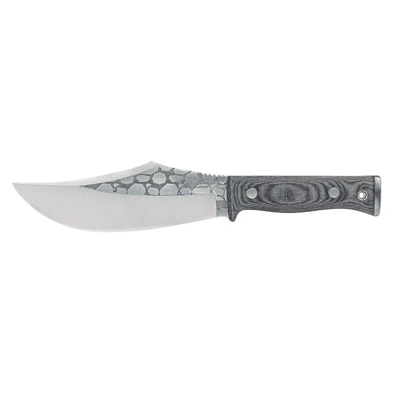 Le Gryphus Bowie de chez Condor Tool & Knife est un poignard extrêmement solide et performant. D’une longueur totale de 29cm, il comprend une lame clip point d’environ 17cm de longueur, construite en acier carbone 1075 et partiellement décorée de motifs façon « écailles ». La lame est fixe et avec demi-garde, possibilité de gravure au niveau de la partie inférieure (en supplément). Le manche du couteau Gryphus Bowie Condor est conçu en micarta gris, matériau à base de résine mélangé à du coton/papier. Les avantages du micarta sont multiples : résistance aux chocs et à l’eau mais aussi la durabilité. La longueur d’environ 12cm de la poignée offre une prise en main très confortable. Poignard livré avec son étui de type kydex à fermeture par bouton pression : un must pour l’Outdoor !