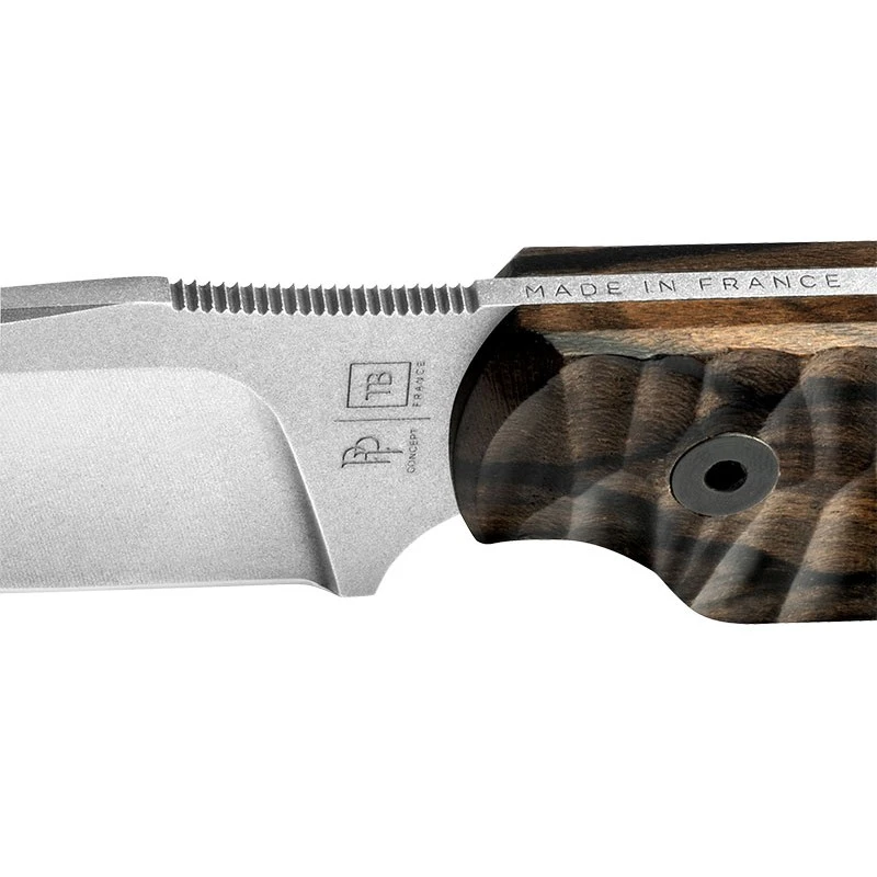 Cette version est équipée de côtes en ziricote, un bois précieux provenant d’Amérique centrale. Ce dernier loge un passe-lacet qui améliore nettement la transportabilité. Tous les Commandeurs® sont livrés avec un étui en kydex noir de haute qualité, orné du logo TB embossé. Ils sont également accompagnés d’une boîte technique soigneusement conçue.