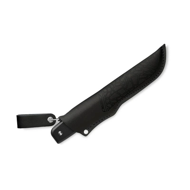 Le poignard Marttiini MFT, référence 354010, c’est aussi un manche noir en G10 dont la forme assure énormément de confort au moment de la prise en main. Si besoin est, les éléments de la poignée peuvent être serrés. Grâce à ses lignes épurées ainsi que le motif graphique sur l’étui de protection en cuir noir, ce poignard polyvalent bénéficie d’un look très moderne. Une valeur sûre pour celles et ceux en quête de polyvalence et de robustesse !