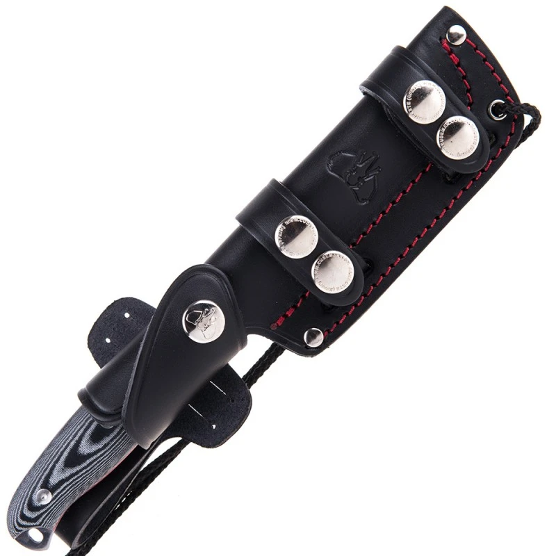 L’étui en cuir noir est particulièrement soigné et renforce le cachet du couteau. Les boutons pression permettent une bonne rétention du couteau pour un transport en toute sécurité.